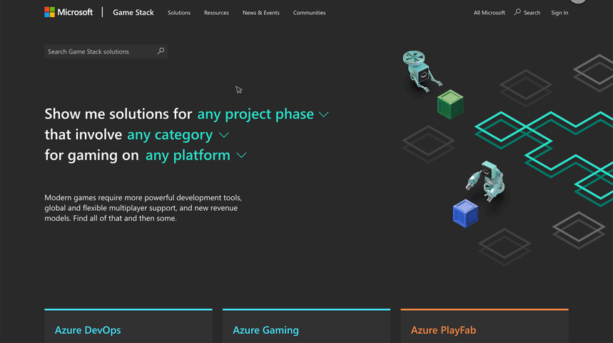 Game Stack is an initiative that aims to create a one-stop-shop for all things relating to game development at Microsoft. In order to solve the problem of having all of our game development products and resources spread across various areas of our ecosystem, I was tasked with helping to create a web experience that would properly showcase those items and help customers find what they were looking for.